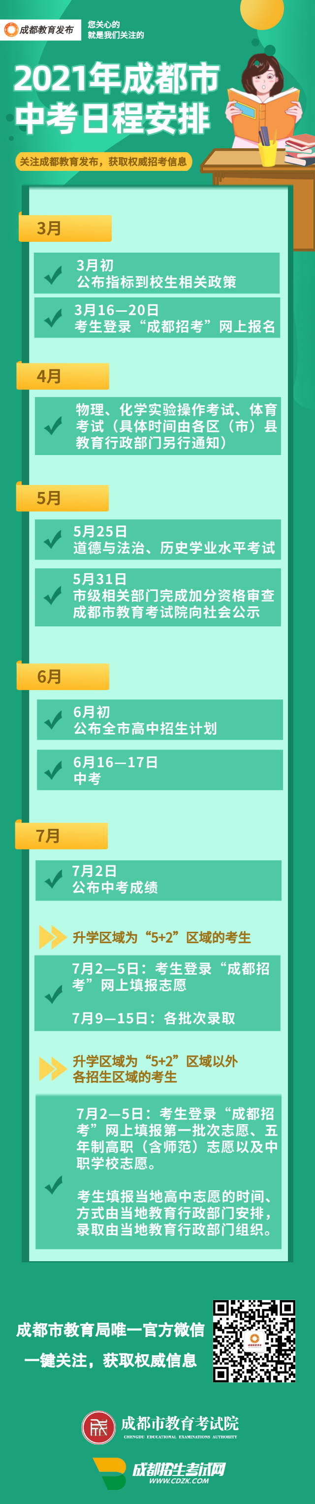根据2021年端午节放假安排,今年我市中考语文、物理、化学、数学、英语5科统一考试时间定为6月16、17日(具体安排见图解),让考生能够有更加充足的时间复习迎考。在此之前,考生将按照各区(市)县教育行政部门的安排完成体育考试以及物理、化学实验操作考试。