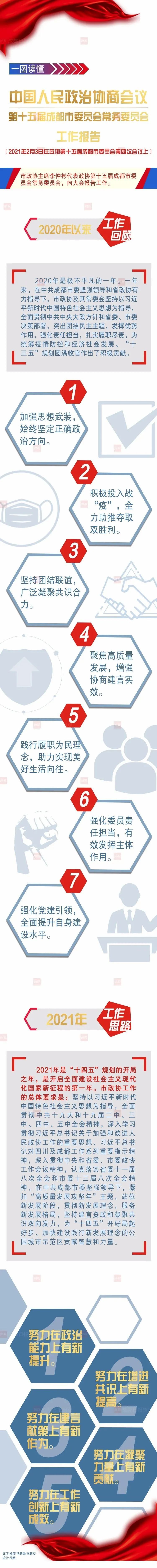 在大会审议通过市政协十五届四次会议议程后,李仲彬代表市政协十五届常委会向大会作工作报告。报告指出,2020年是极不平凡的一年。一年来,在中共成都市委坚强领导和省政协有力指导下,市政协及其常委会坚持以习近平新时代中国特色社会主义思想为指导,全面贯彻中共中央大政方针和省委、市委决策部署,突出团结民主主题,发挥优势作用,强化责任担当,扎实履职尽责,为统筹疫情防控和经济社会发展、“十三五”规划圆满收官作出了积极贡献。报告回顾了市政协常委会一年来所开展的主要工作:加强思想武装,始终坚定正确政治方向;积极投入战“疫”,全力助推夺取双胜利;坚持团结联谊,广泛凝聚共识合力;聚焦高质量发展,增强协商建言实效;践行履职为民理念,助力实现美好生活向往;强化委员责任担当,有效发挥主体作用;强化党建引领,全面提升自身建设水平。报告指出,2021年是“十四五”规划的开局之年,是开启全面建设社会主义现代化国家新征程的第一年。市政协工作的总体要求是:坚持以习近平新时代中国特色社会主义思想为指导,全面贯彻中共十九大和十九届二中、三中、四中、五中全会精神,深入学习贯彻习近平总书记关于加强和改进人民政协工作的重要思想、习近平总书记对四川及成都工作系列重要指示精神,深入贯彻中央和省委、市委政协工作会议精神,认真落实省委十一届八次全会和市委十三届八次全会精神,在中共成都市委坚强领导下,紧扣“高质量发展攻坚年”主题,站位新发展阶段,贯彻新发展理念,服务新发展格局,坚持建言资政和凝聚共识双向发力,为“十四五”开好局起好步、加快建设践行新发展理念的公园城市示范区贡献智慧和力量。一是努力在政治能力上有新提升,坚持把学习贯彻习近平新时代中国特色社会主义思想作为重中之重,提高政治判断力、政治领悟力、政治执行力。二是努力在增进共识上有新提高,充分发挥“重要阵地”“重要平台”“重要渠道”作用,画好同心圆、增强向心力。三是努力在建言献策上有新作为,聚焦唱好“双城记”、服务新格局、建好示范区、办好大运会“四件大事”和编制实施“十四五”规划纲要、实施幸福美好生活十大工程,多建睿智之言,多谋务实之策。四是努力在凝聚力量上有新贡献,切实践行履职为民的理念,有效发挥联系广泛的优势,积极为贯彻落实中共中央大政方针和省委、市委决策部署凝聚人心、汇聚力量。五是努力在工作创新上有新成效,建立完善政协协商工作规则,深入推进专委会“六个转变”,深化委员学习培训,加强政协系统党的建设等,推动全市政协工作迈上新台阶。徐玖平代表市政协十五届常委会,向大会报告市政协十五届三次会议以来提案工作情况。市政协十五届三次会议以来,共收到提案929件,立案742件,均已按时办结。大会书面听取市政府关于实施幸福美好生活十大工程的说明。范锐平代表中共成都市委向大会召开表示热烈祝贺,向全体政协委员和与会同志致以诚挚问候。范锐平指出,2020年,成都融入“双循环”、唱好“双城记”、建好“示范区”、夺取“双胜利”,经济社会发展取得了来之不易的成绩。这得益于以习近平同志为核心的党中央举旗定向、掌舵领航,得益于省委省政府坚强领导、关心支持,得益于全市广大干部群众和社会各界凝心聚力、共同奋斗,也饱含着各级政协组织和广大政协委员的辛勤汗水、智慧力量。范锐平指出,市委十三届八次全会深入贯彻落实党的十九届五中全会精神和省委决策部署,以践行新发展理念的公园城市示范区建设为统领,作出幸福美好生活十大工程战略部署,就是要为市场主体创造蓬勃发展的新机会,为新兴产业培育广泛应用的新场景、为青年人才搭建圆梦筑梦的新舞台,为广大市民提供美好生活的新体验。成都将致力推动实现共同富裕,让市民收入更加丰厚、生活更加殷实;致力创新高品质公共服务供给,让公共产品更加优质普惠、更加共享可及;致力厚植生活成本竞争优势,让城市更加幸福宜居、生活更加巴适安逸;致力提升城市通勤效率,让职住更加平衡适宜、出行更加便捷舒适;致力推进城市有机更新、全面完成老旧小区改造,让市民家园更有颜值、市井生活更有品味;致力营造生态惠民场景,让市民在大都市望见雪山、漫步绿道、亲近自然;致力打造稳定公平可及的营商环境,让市场主体安心投资、专心经营、全心发展;