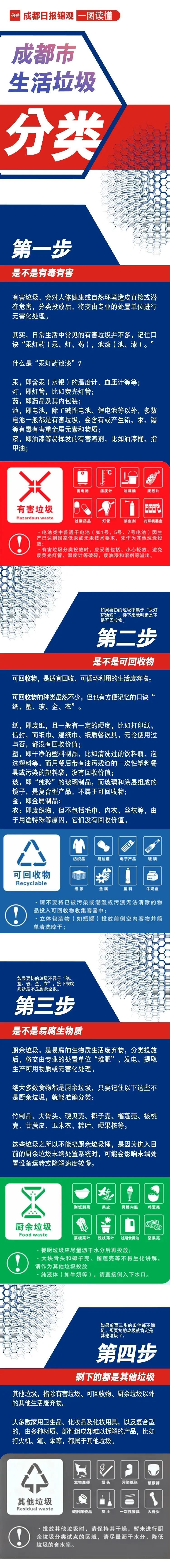 二、市民可以在网上搜索《成都市生活垃圾分类投放指南》,该指南根据市民调查结果,对常见的垃圾品种进行分类,并列举了每种分类中常见的垃圾,方便市民对照投放。