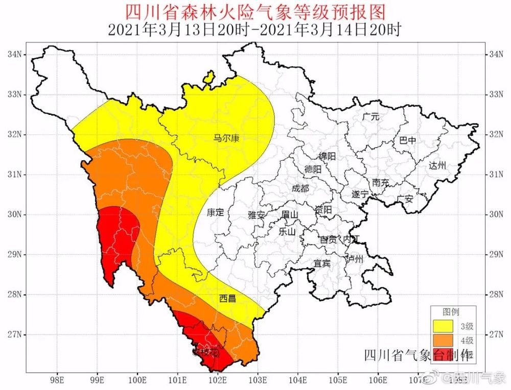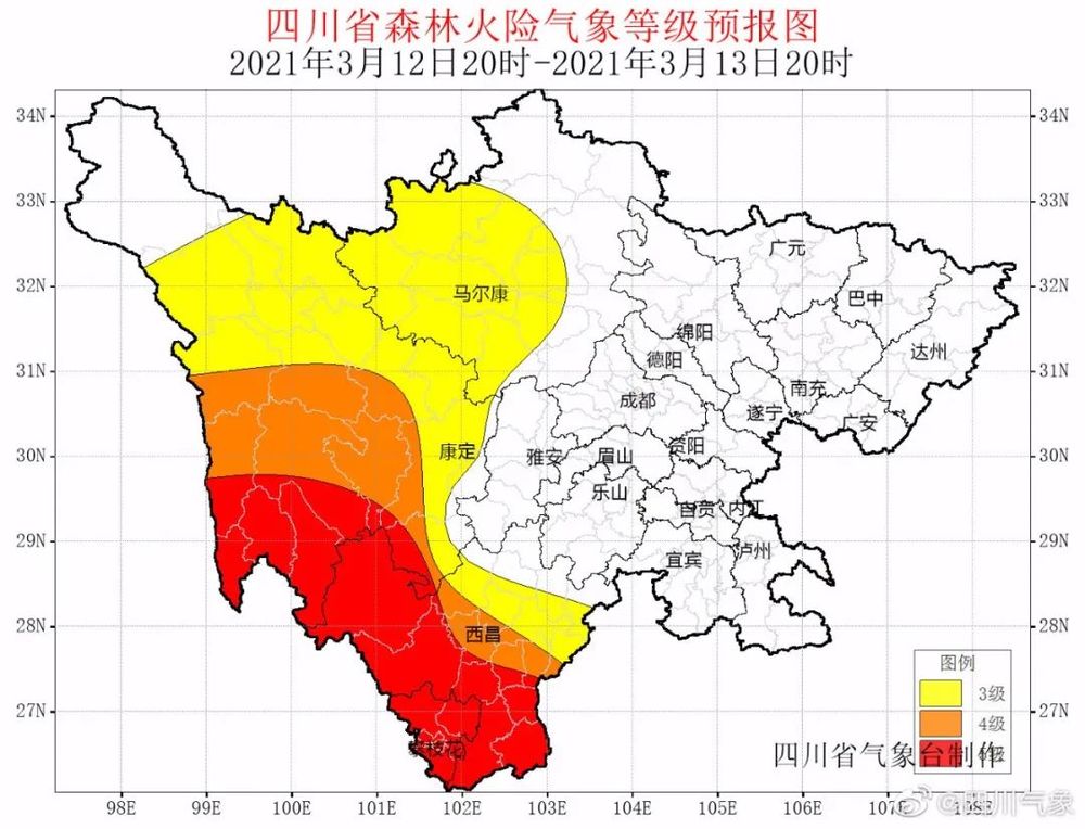 四川省气象台根据最新气象资料分析,持续发布森林草原火险气象等级预报:预计2021年3月12日~14日,甘孜州中部和南部、攀西地区大部地方以多云间晴天气为主,空气干燥,部分地方森林火险气象等级可达4~5级。请相关州市加强火源管理,做好森林防火工作。