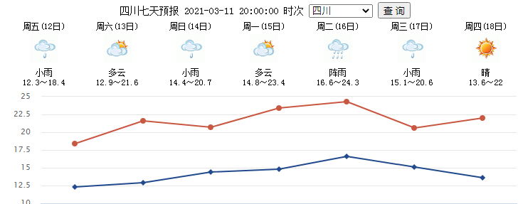 下周四川的气温还会进一步上升,到下周二(3月16)四川的平均最高温度会达到24.5℃,周三做一个短暂的回调后,气温又会继续爬升。