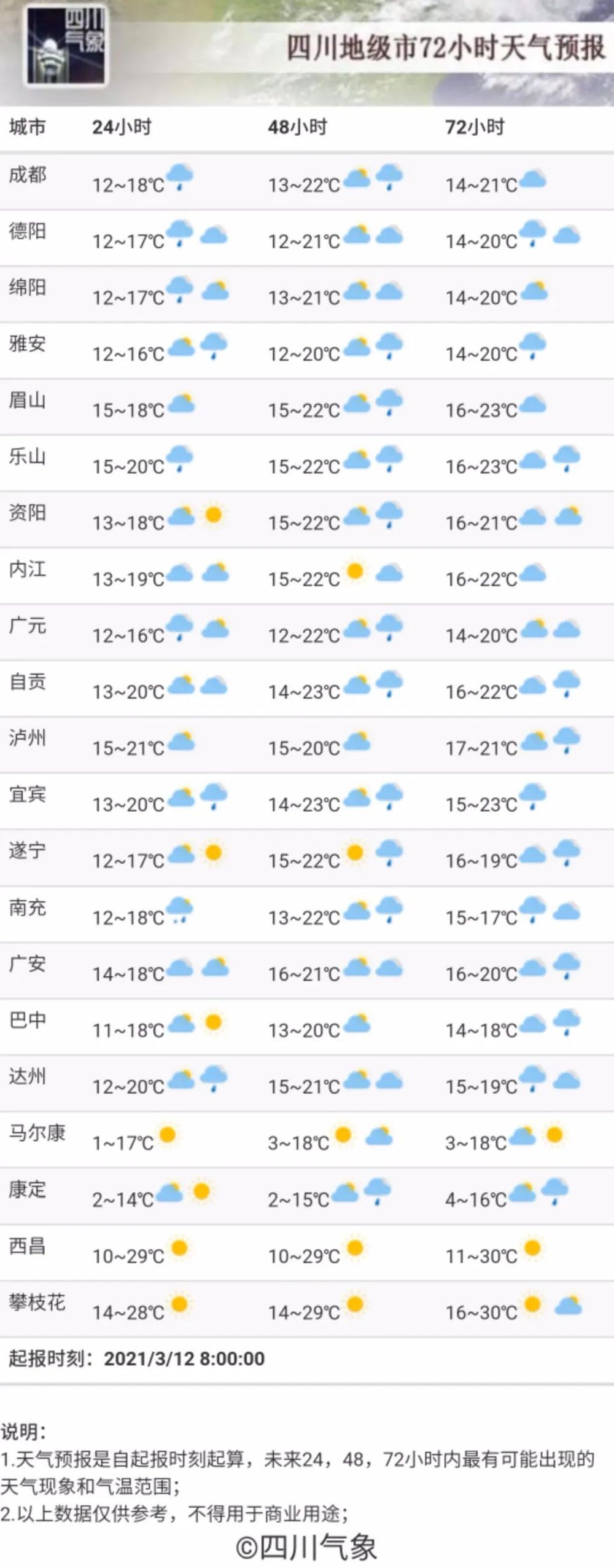 可以看到,周末两天,四川大部分市州最高温都在20℃以上,西昌和攀枝花甚至冲上30℃,直接过“夏天”了!并且,眉山、乐山、泸州等地的最低温也接近20℃,昼夜温差也在渐渐缩小。虽然……天气以阴天和下雨为主……