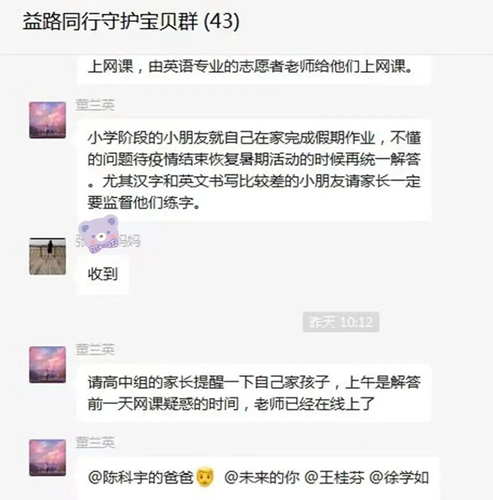 从7月19日开始,老师和志愿者们通过腾讯会议,每日上午9:30为5名初升高和4名初二升初三的孩子提供学习辅导,下午1:00至4:00为初升高及高中阶段的6名孩子提供专业的理科培训。同时在守护宝贝家长群,社工指导小学小朋友的家长引导孩子做好每日计划,按计划完成当日内容,同时加强体育锻炼,增强体质。