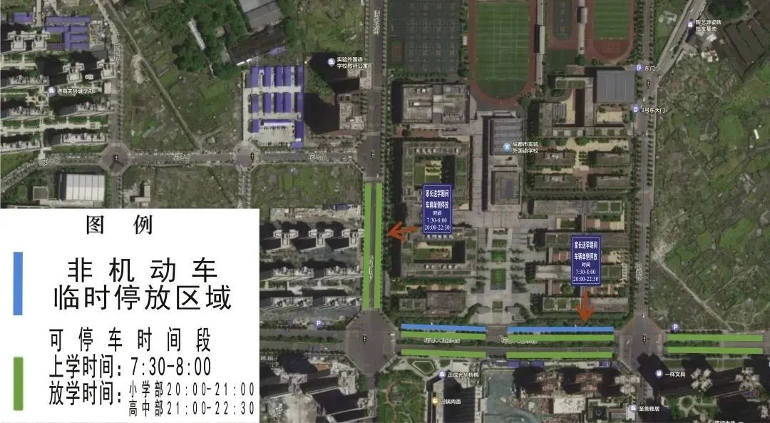 为缓解广大学生家长接送学生时造成道路拥堵问题,以下时间段家长可将机动车停放在花都大道东段与清泉北街道路两侧,双边单排停放,确保安全,即停即走。
