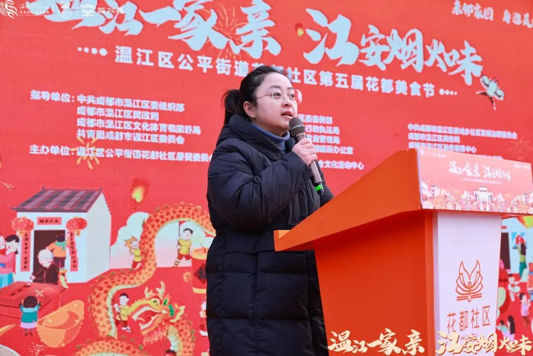 花都社区党委书记居委会主任何沁耘在活动现场致辞,对到场领导表示欢迎及感谢,并对前四届美食节进行总结、对第五届美食节表示期待。