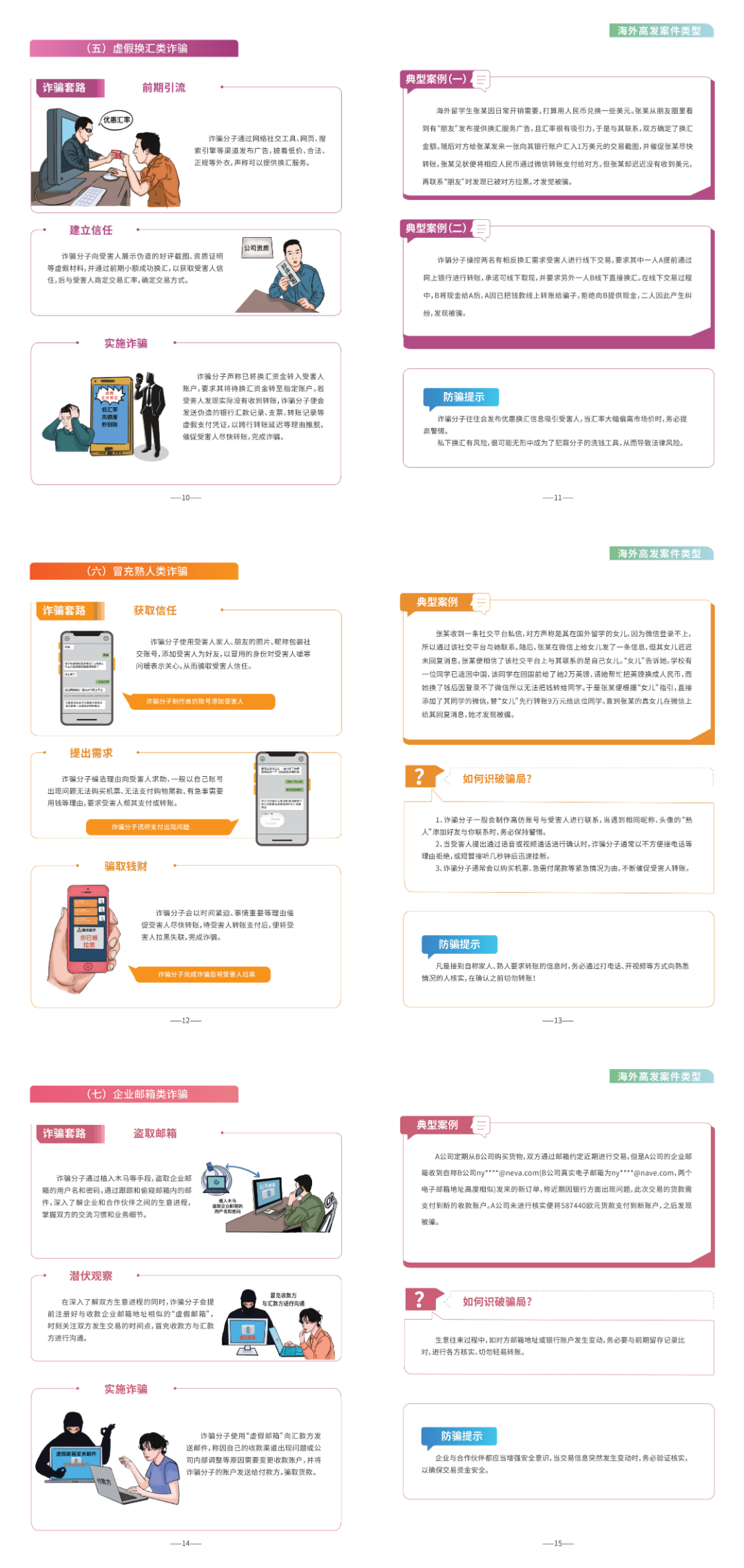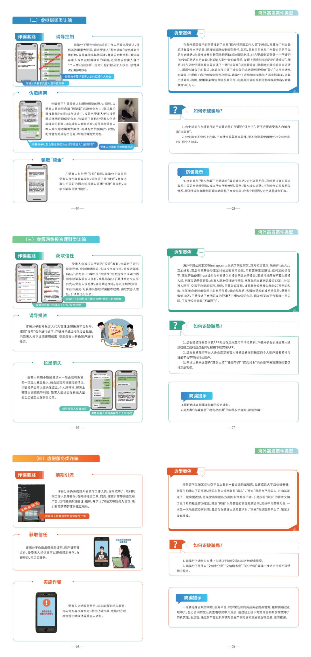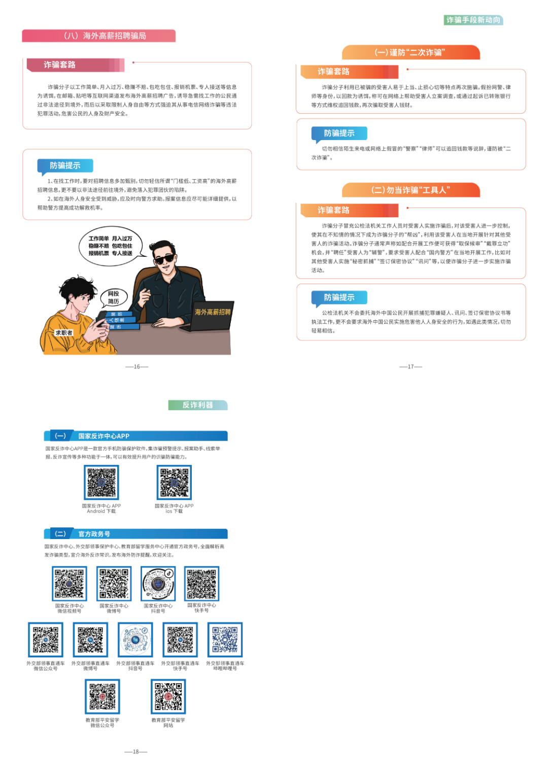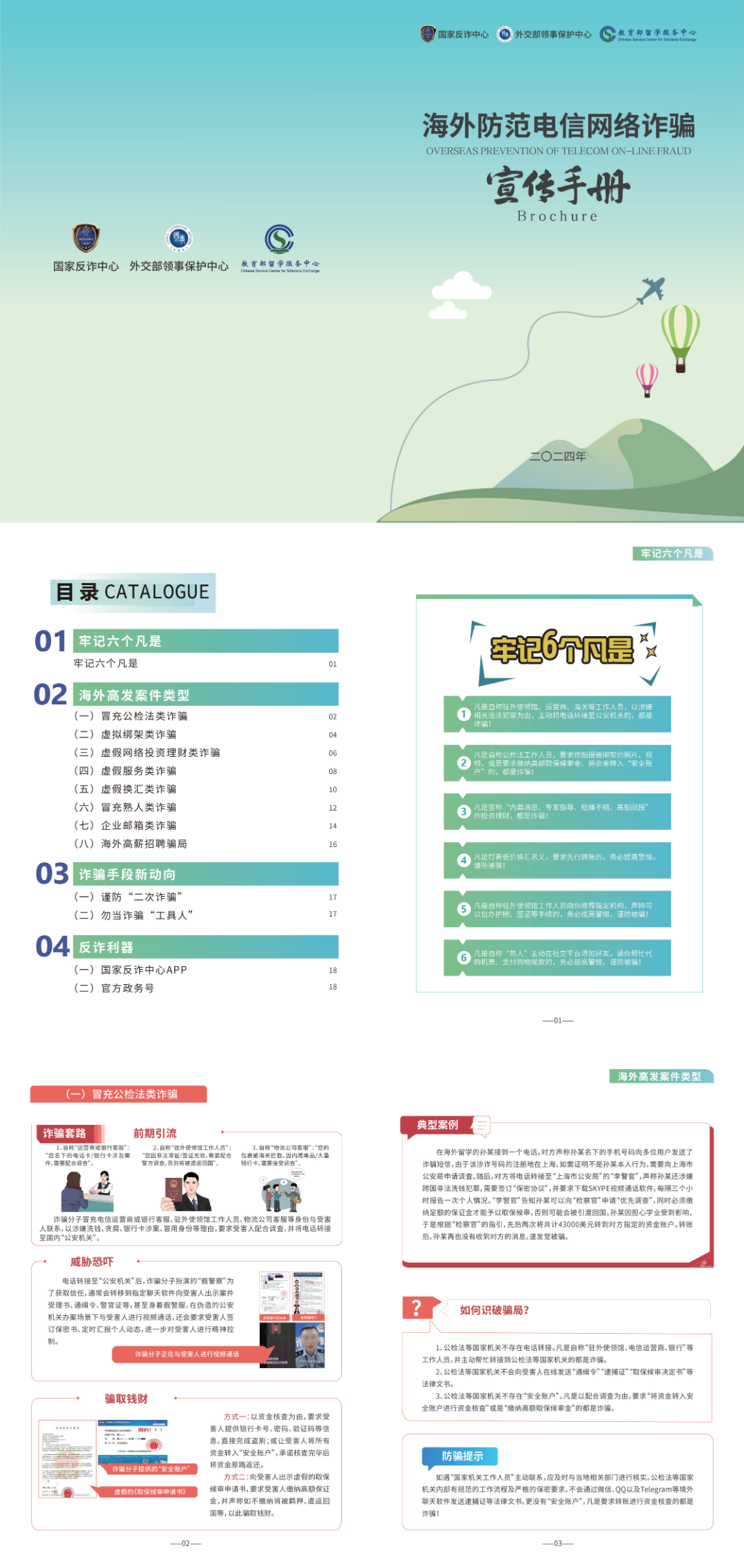 2023年以来,涉海外中国公民的电信网络诈骗案件多发,诈骗套路手法不断翻新、层出不穷,严重损害海外中国公民合法权益。公安机关工作中发现,诈骗分子通常谎称自己系中国驻外使领馆、公检法机关工作人员,以受害人护照等证件到期需补办、身份证信用卡被冒用,或涉及重大刑事案件等为由实施诈骗。特别在一些案件中,诈骗分子冒充警察、律师等身份,利用受害人钱款被骗后紧张自责、想要止损的心理,以帮助其维权追损为由,索要“好处费”“辛苦费”或“押金”“保证金”等,对受害人进行“二次诈骗”,造成恶劣影响。为有效遏制此类诈骗多发势头,增强海外中国公民防范能力和自我保护意识,国家反诈中心联合外交部领事保护中心和教育部留学服务中心精心编制了《海外防范电信网络诈骗宣传手册》,重点介绍8类海外高发诈骗案件类型及相关典型案例,围绕防范“二次诈骗”等介绍诈骗手段新动向新套路,详细梳理国家反诈中心APP等反诈利器的功能特点和使用方法,有针对性发布识骗方法和防骗提示。
