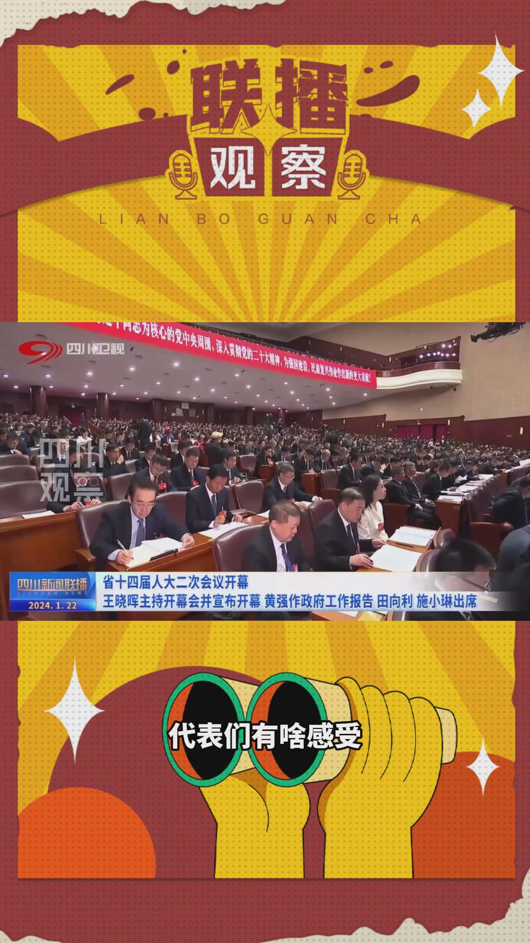 《联播观察》,今天聊点啥?今天上午,省十四届人大二次会议开幕啦!四川省人民政府工作报告新鲜出炉。在现场听了黄强省长的报告,代表们有啥感受?走出会场时,我们第一时间采访了他们。