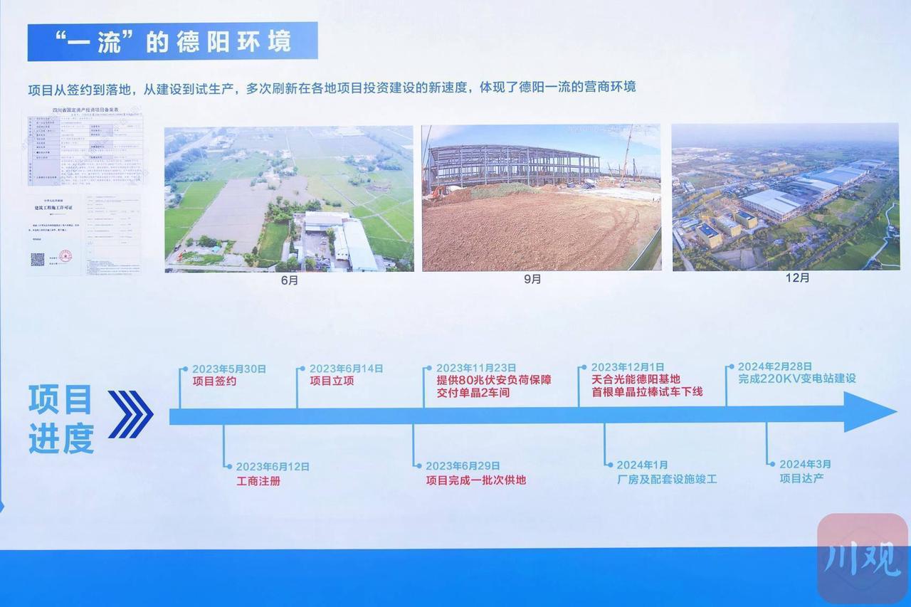 在德阳什邡市,当地政府展示的3张照片,记录了半年之内什邡市天合光能新材料产业园从荒地到160亿元产业项目落地生根的全过程。无论是25天完成504亩项目用地的征拆工作,还是26天完成场平及施工水电接入,都展示着什邡市政府的决心。